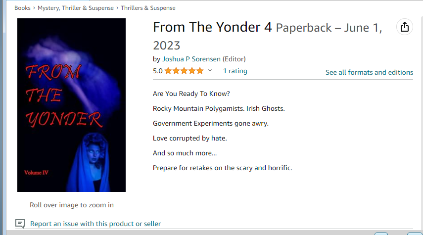 Later this year “The Stick Men” (2790 words) will be out in From the Yonder 5. I’ve reworked the story a number of times trying to get it just right. It’s a very dark horror piece that came from a story my Mom told me. She said she saw the stick men when she was a girl. She was adamant it was real and said she was going to write about it. I don’t think she ever did, since I couldn’t find anything about it in her things after she died. It’s a pity. I would love to have had that as a reference for the story. I’m not sure exactly when From the Yonder will be out, but FTY3 and FTY4 came out in successive Junes, so I’m guessing June 2024.